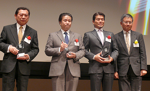新設4部門の受賞メーカー。左からスリックの高田昌一常務、エレコムの福良卓二スーパーバイザー、アップルの竹林賢広報部長、BCNの奥田喜久男社長 今年は、「タブレット端末」「タブレット端末アクセサリ」「三脚・一脚」「スマートフォン」の4部門を新設。また、伸び率が高く、震災復興にも活躍が期待される「CADソフト部門」を再び表彰対象部門とした。表彰式は、新設部門受賞社――アップル(タブレット端末/スマートフォン)、エレコム(タブレット端末アクセサリ)、スリック(三脚・一脚)――へのトロフィー授与で幕を開けた。