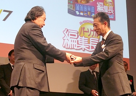 販売店代表者からトロフィーを授与。筆まめの萩原義博社長(左)にトロフィーを贈るグッドウィルの田中満祐代表取締役 トロフィー授与終了後には、同一部門で10年連続受賞したアドビ システムズ、エレコム、バッファローの3社をあらためて紹介。会場に大きな拍手が響いた。