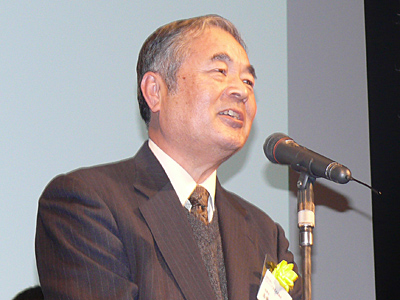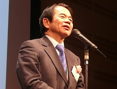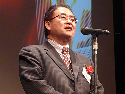 NPO法人ITジュニア育成交流協会の高橋文男理事長 続いて、「BCN AWARD」の受賞社を代表して、NECパーソナルコンピュータの加藤秀章執行役員常務が登壇。「今年の業界には、Windows 8やウルトラブックなどの話題がある。当社も心をワクワクさせるイノベーティブな製品を出して、業界を盛り上げていきたい」と今年の抱負を語った。