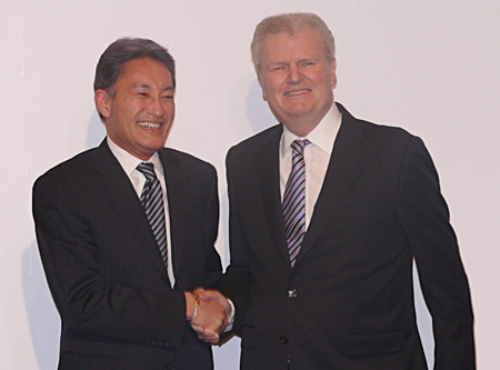 次期社長兼CEOの平井一夫副社長(左)とハワード・ストリンガー会長兼社長CEO