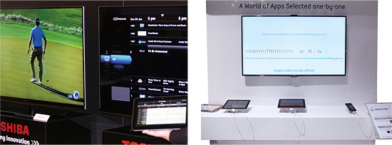 東芝は、タブレット端末の次世代アプリとして、テレビ放送の番組とビデオ・オンデマンドの番組を統合して横断的に検索できる「メディアガイドApp」と、ケーブルテレビのセットトップ・ボックスやAVアンプ、ブルーレイレコーダーなどを統合管理して操作できる「リモートApp」を発表。この二つのアプリをタブレット端末に搭載し、さまざまなコンテンツを、いつでも、どこでも楽しめる環境をつくろうとしている。サムスン電子も、アプリの追加や動画配信サービスに対応した薄型テレビ「Smart TV」のブランディングの一環として、タブレット端末が薄型テレビに映し出すコンテンツを自由に操作する端末として役割を果たすことをアピールしていた。