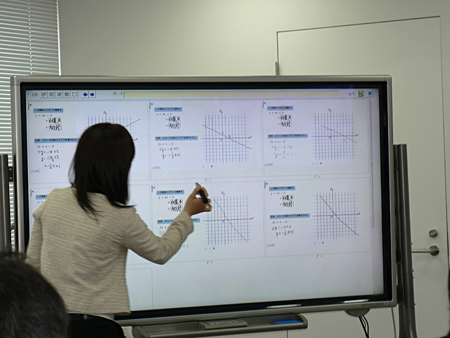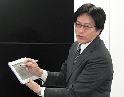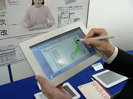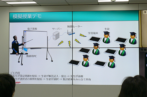 「BIG PAD」と「JL-T100」を組み合わせた授業のデモンストレーション。生徒の回答をもとに授業ができる 田中淳司パーソナルソリューション事業部ソリューション企画部部長は、「シャープは28年前から教育関連市場に向けた取り組みを始めた。学校向け教育支援システム『スタディシリーズ』については、累計8000校が導入した」とこれまでの実績を述べ、今後について、「『BIG PAD』とタブレット型学習端末『JL-T100』を組み合わせて、学校教育ソリューション展開を強化していく」と述べた。「JL-T100」は、「4万円を切る価格で提供したい」としている。