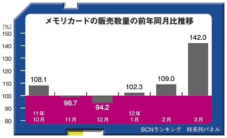 昨年10月に発生したタイの大洪水で供給がストップし、昨年末はHDD搭載機器を中心にIT関連製品の生産が大幅に減少した。メモリカードも店頭で品薄状態が続いた。家電量販店の実売データを集計した「BCNランキング」によれば、メモリカードの販売数量は昨年11月が前年同月比98.7%、12月が94.2%と厳しい状況だった。それでも、今年に入ってからは供給が回復し、店頭の品揃えが潤沢になって販売が増加している。販売数量の前年同月比は、1月が102.3%、2月が109.0%。3月が142.0%と、好調が続いている。