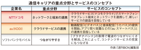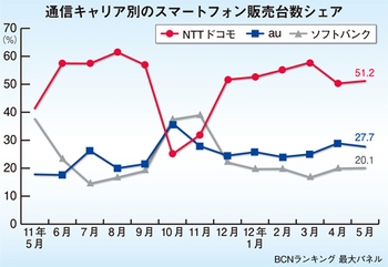 電気通信事業者協会(TCA)によれば、今年5月末時点の携帯電話の純増数は、NTTドコモが12万6600、auが19万9000、ソフトバンクモバイルが25万8100。家電量販店での実売数をBCNランキングでキャリア別スマートフォンの販売台数シェアをみると、5月はNTTドコモが51.2%、auが27.7%、ソフトバンクモバイルが20.1%だ。この争いは、これからますます激化していく。これまでスマートフォンの普及に向けて端末の性能をアピールしてきたキャリア各社。この活動は継続しながらも、自社の契約者を増やすために独自のサービスを提供して、1ユーザーあたりの収益を上げていくフェーズに入っている。(佐相彰彦)