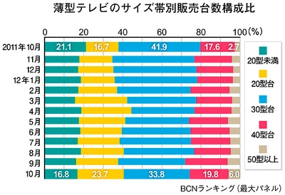 昨年10月と販売台数構成比を比べると、30型台では8.1ポイント減少している一方で、40型以上では5.5ポイント、30型未満では2.7ポイント拡大している。