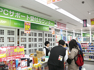 LABI秋葉原パソコン館はテクニカルサポートの売り上げが大きいという また、LABI秋葉原パソコン館は日替わりの限定品にも力を入れている。独自に作成したチラシを街頭で配ってお客様を誘導。秋葉原を訪れた人だけが知ることができるプレミア情報ということで、チラシの商品は超特価に設定し、午前8時~8時30分に並んだお客様を対象に、抽選で販売する仕組みだ。中村店長によれば、「毎朝、100~200人は並ぶ」という。タイムセールも、「土・日曜日は毎週、メーカーとタイアップして実施している。時にはゲリラ的に行うこともあって、店はお客様で一気に埋まる」(中村店長)という人気だ。