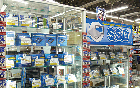 2011年に発生したタイの洪水の影響によって生産が滞ったことで、価格が高騰したHDD。一方、SSDは、高速のデータ読み出し・書き込みが注目され、購入者が増加している。自作パソコンや手持ちのパソコンの性能向上を求めるユーザーが訪れる街・秋葉原でも、家電量販店やパソコン専門店の多くが「SSDの長所を認識して買い求めに来られるお客様が増えた」と口を揃える。販売は、2012年の年間を通じて好調で、店頭でもアピールに余念がない。