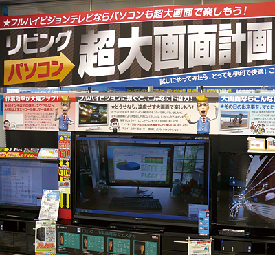 ソフマップ秋葉原本館では薄型テレビとレコーダーの連携をデモでアピール エディオン秋葉原本店では、薄型テレビをパソコンとつないで、画像や動画のデータを表示することを提案。薄型テレビのさまざまな使い方と大画面のメリットを訴えることで、買い替え促進につなげている。