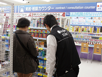 家電製品の販売は、買いやすい売り場づくりとスタッフの接客がカギを握る。エディオン広島本店が「お客様がデモなどで体感したことをもとに、日常生活で使うシーンをイメージしていただくために、スタッフが言葉でわかりやすく説明する」(山田店長)ことを徹底するなど、広島市では接客を重視している家電量販店やパソコン専門店が多い。 エディオン広島本店では、パソコンコーナーで5年前など旧モデルと最新モデルを比較する展示など各コーナーで商品のよさを体感できるデモに力を入れている。さらに、「商品知識向上のため、主力商品を熟知する勉強会を実施している」(山田店長)という。主力商品は1か月単位で変わり、1か月あたり5アイテム程度。スタッフにはスタンプカードを配布して、「ラジオ体操のように出席したらスタンプを押していく」というやり方で、楽しみながら学べる環境をつくっている。また、「日々の勉強会では、優秀スタッフの接客をロールプレイング形式で学んでいる」という。このロールプレイングはスタッフが自発的に行っているそうで、「スタッフには、お客様に気持ちよく買い物をしていただきたいという気持ちがある。高いスキルを基盤に、お客様に満足していただける接客を行っている」と自慢する。実際の接客では、購入に結びつけるための接客の一つとして「高齢の方が多いことから、お客様に座っていただいて、しっかりと説明を聞いてもらう」という。