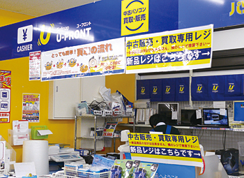 パソコン専門店でも、近くの店にはないサービスカウンターによって来店者が増えている。パソコン工房広島商工センター店では、ソフマップとの協業によって設置している買取りセンター「U-FRONT」が好調。田邊店長は、「買取金額を元手に当社ブランドのパソコンを購入するお客様が多い」とアピールする。