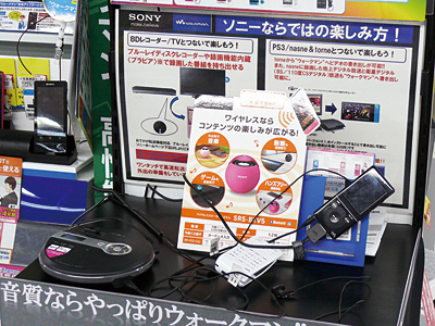 携帯電話やスマートフォンで手軽に音楽を楽しめるようになって、専用機である携帯オーディオプレーヤーが苦戦している。ヤマダ電機LABI広島では、「携帯オーディオは音楽を聴くための専用端末なので、スマートフォンと比べれば音がいい。体感してもらうことが大切」(高橋圭一副店長)と判断して、デモコーナーを設置。さらに、ソニー製品の展示ではスピーカーの「SRS・BTV5」も組み合わせて「つなげる楽しさ」を演出している。デモによって、携帯オーディオの音質のよさ、スマートフォンとの違いに気づくお客様が増え、購入に結びついているという。