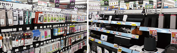 コジマNew広島インター緑井店では、「携帯オーディオの販売は減少しているが、周辺機器の品揃えを充実させている」(加藤竜治店長)という。販売減には、iPhoneユーザーの増加が影響しているとみて、店内では「iPod」を前面に打ち出しながらスピーカーを展示した。iPhoneで使える製品でも、「スマートフォンをもっていないお客様にiPodをアピールしている」という。また、アクセサリの品揃えも充実させており、「すでに携帯オーディオをもっているお客様に好評」だそうである。
