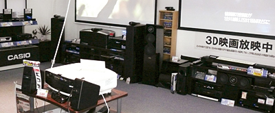 エディオン広島本店では、「プロジェクターの販売は、とにかくまずデモで体感していただくことが欠かせない」(山田店長)と判断。コーナーごとにさまざまな工夫を凝らしているのが特徴の広島本店がプロジェクタコーナーで行っているのは、3D映画の放映だ。「一度は視聴してみたいと、立ち寄るお客様が多い」と、当初のもくろみ通りの役割を果たしつつある。