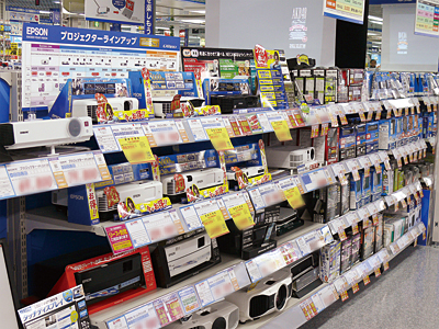 プロジェクターは、かつて大画面の映画館のような環境で自分の好きな映画を楽しむホームシアターのニーズに支えられた商品だった。しかし、最近では手頃な価格の製品も多くなり、テレビ代わりに使うユーザーが増えている。 ヤマダ電機LABI広島では、圧倒的な品揃えでプロジェクターをアピール。高橋副店長は、「プロジェクターにはさまざま種類があるということをお客様に知っていただくことがいちばん」だとしている。最近は、小型で持ち運びに便利なモデルが売れており、「個人・法人を問わず、人気は高まりつつある」という。