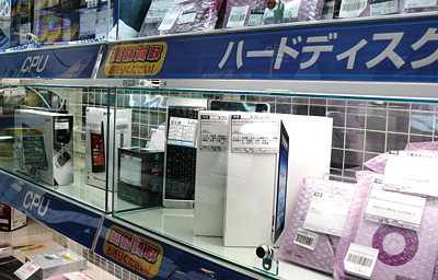 HDDは、外付けHDDが依然として好調だ。デジタルカメラやデジタルビデオカメラで撮影した静止画や動画を保存するストレージとして、大容量の外付けHDDが売れている。また、薄型テレビと接続するレコーダーの用途も定着している。パソコンとテレビの両方で使えることから、家電量販店にとっては稼ぎ頭の一つになっている。 「何でも揃っている」がモットーのヤマダ電機LABI広島は、外付けHDDに関しても圧巻の品揃えを誇る。パソコン・周辺機器フロアで壁一面に商品を展示するだけでなく、テレビ関連のフロアにホームネットワーク体験コーナーを設け、NAS(ネットワーク・アタッチド・ストレージ)も提案している。最もポピュラーなのがテレビ番組の録画用途で、「2TBクラスの大容量モデルが売れ筋」(高橋副店長)という。