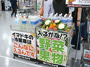白物家電のデモは、他店と一線を画している。例えば冷蔵庫では、人気機種に関しては、野菜やペットボトルなどがどれだけ入るかを実際に試せる。洗濯機でも、1回で洗濯できる量を洗濯物で具体的に表現。御代川店長は、「他店でやっていないことをやる──これを常に念頭に置いている」と説明する。