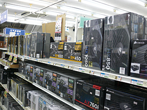 マザーボードをはじめケースや電源などのパーツがずらりと並んでいる。鈴木代表取締役は、「サービスと品揃えはバランスが大切。自作パソコンのお客様が多いので、パーツに関しては大型店舗に負けない品揃えをしている」と自信をみせる。