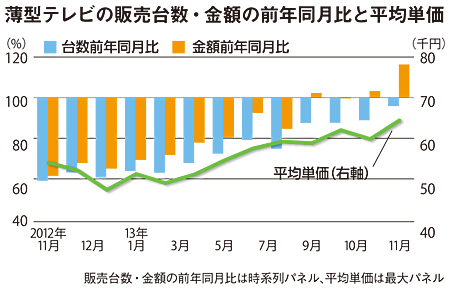 11月、薄型テレビの販売金額前年同月比は16.3%増。販売台数こそ4.1%減とわずかながら昨年に届かなかったものの、販売金額が前年を上回ったのは8月、10月、11月と2011年7月以降3回目で、今回が最大だ。回復の足取りはしっかりしてきた。年末商戦に向けて徐々に活気を帯び、販売台数の前年越えもみえてきた。(道越一郎)