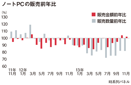 販売台数では11月でも18.2%減と、今年に入って連続して2ケタのマイナスが続いているが、平均単価がこの一年で2割超も上昇し、販売金額を押し上げている。11月の税抜平均単価は8万5200円と、2010年11月の8万4300円を抜き、過去3年で最高を記録した。消費税の増税とWindows XPのサポート終了などの追い風を受けて、年末から春にかけては活況が期待できそうだ。(道越一郎)