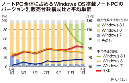 販売金額も30.8%増と、過去3年で最も高い伸び率を記録した。最大の要因は、Windows 8.1搭載モデルの拡大だ。8.1搭載モデルの税抜平均単価が10万円を切ると同時に販売が伸び、台数構成比が過半数を占めるまでになった。加えて、Windows XPのサポート終了に伴う買い替え需要や、消費税増税を控えた駆け込み需要も刺激しているものとみられる。(道越一郎)
