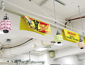 提灯の装飾で浅草らしさを出している 品揃えについては、観光客の購入促進を目的に、電池やスマートフォンケースなど、気軽に購入できる商品を充実させ、それらのコーナーを