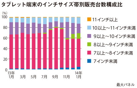 主役は、8インチから9インチ台の製品だ。軽量化した9.7インチのiPad Airが昨年11月1日に登場したことで、9インチ台が勢いを取り戻しているのに加え、レノボやASUSなどが年末に投入した格安の8インチ台Windowsタブレットが好調。新製品の重さ・厚さなどによって、今後もサイズ別の勢力図はまだまだ変わっていきそうだ。(道越一郎)