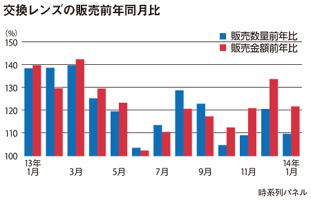 今年1月の販売本数は9.1%増にとどまったが、販売金額は21.2%増と堅調。税抜平均単価は4万円台半ばから5万円台前半で上下しながらほぼ安定し、右肩上がりの基調を保っている。ここ3年の変化でとくに大きいのは、単焦点レンズの増加だ。2011年1月の販売本数構成比は40.0%だったが、今年1月には49.6%とほぼ半数に達した。一眼レフやミラーレスカメラを手にする人が増えたことで、明るく、すぐれた描写力をもちながらも比較的安い単焦点レンズを見直す動きが活発になっている。(道越一郎)
