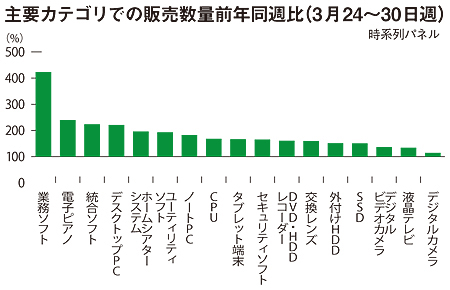 BCNランキングで集計する141カテゴリ中、最も伸びたのが増税に直接関連する業務ソフトで、実に前年同週比423.1%という突出した伸びを示した。このほか、電子ピアノが239.6%、デスクトップPCが220.7%、ホームシアターシステムが195.9%、液晶テレビが133.9%など、ほぼ8割のカテゴリが前年を上回った。150%以上のカテゴリは46にも及び、多くの製品群で駆け込み購入が起こっていたことがわかった。(道越一郎)