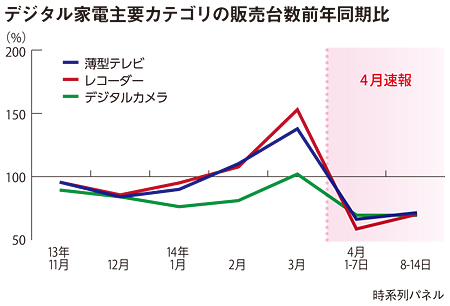 4月1~7日(初週)の薄型テレビは販売台数前年同期比で66.4%と3割以上の大幅減を記録したが、8~14日の7日間(第2週)は71.4%と、マイナス幅が改善。レコーダーも、初週の58.7%が第2週には70.0%になった。一方、デジタルカメラは初週が69.6%で、第2週も69.5%と大きなマイナスのまま。低価格コンパクトカメラが縮小する流れから、当面この傾向は続きそうだ。(道越一郎)