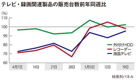 戻ってきたとはいえマイナス圏にある液晶テレビよりも、レコーダーのほうが回復の足取りは力強い。同様に、外付けHDDも前年並み水準に回復。開幕を直前に控えたサッカー・ワールドカップは、ブラジルとの時差の関係で試合時間が深夜・早朝になる。これを起爆剤に、録画需要が動き出したという見方ができそうだ。(道越一郎)