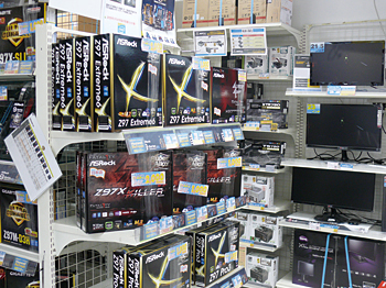 ドスパラは秋葉原電気街に、パソコン販売を主とする秋葉原本店、パーツ専門店のパーツ館、スマートフォンや関連製品を揃えたモバイル館の3店舗を構える。ドスパラ横浜駅前店は、この秋葉原の3店舗を集約したような店舗だ。崔店長は、「横浜近辺にお住まいの方が秋葉原電気街に行かなくても足りる商品を揃えている」と力説する。ほかの店舗よりも力を入れているというパーツでは、人気のASRockのマザーボードを前面に押し出したコーナーを設置。「最新モデルを切らさないように、在庫管理に留意している」(崔店長)という。ヨドバシカメラやビックカメラにはない最新のパーツがあることから、平日はパソコン上級者や自作パソコンファンが多い。