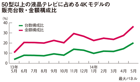 メーカー各社が今年を4Kの拡大期と位置づけ、春から相次いで新製品を投入してきた効果が現れてきた。価格が徐々にこなれてきていることも手伝って、4Kは大型テレビを買うにあたっての大きな選択理由になりつつある。さらに、6月2日にはCSで4Kの試験放送が始まった。一般の消費者も4K映像に触れる機会が増え、販売の伸びを後押ししそうだ。(道越一郎)