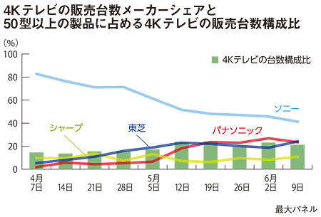 4月の初めまで、ソニーが8割を超えていたメーカーシェアは、競合各社が春夏の新製品で4Kモデルのラインアップを強化した影響で、5月以降大きく変化している。ソニーは依然トップだが、直近の6月9~15日の週では41.3%と半減。一方、税抜きで30万円前後のモデルが好調な東芝とパナソニックが急速にシェアを伸ばしている。価格面からも、当面の主戦場は40~50型台の製品になりそうだ。(道越一郎)