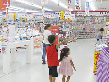 店内には子どもが歩き回る姿が目につく 日用品の販売も開始した。これによって、「大型商品を購入されたお客様のついで買いが多く、客単価の向上につながっている。また、近隣にお住まいの固定客がスーパーでの買い物ついでに立ち寄るという流れが出てきた」(中川店長)という。固定客のほとんどはコジマのポイントカードをもっていて、貯めたポイントで日用品を購入するケースが多い。「日用品を取り扱うようになって、ポイントカードが、固定客の来店頻度をさらに高めるアイテムになった」と、中川店長は効果を語る。