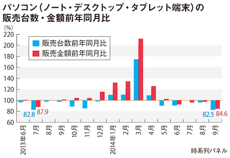 3~4月は増税とWindows XPサポート終了に伴う駆け込み需要で売り上げが拡大したが、5~6月は反動で下落。その後、金額は、わずかながら回復に向けて好転していたものの、9月にその流れが途絶えた格好だ。一時は8万円台まで上昇した平均単価は、9月には6万円台後半まで下がってきている。それにもかかわらず、回復がままならない状況だ。(道越一郎)