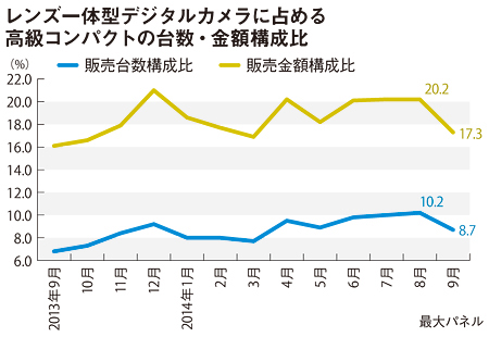 販売金額でも17.3%と2割を割り込んだ。このところ縮小が続くコンパクトデジカメのなかで、なんとか好調を維持してきたものの、ここにきて伸びが止まった格好だ。9月は、デジタル家電全般に売り上げの勢いが弱まっているが、とくに金額の拡大をけん引してきた高価格帯モデルの失速が目立つ。デジカメも同様、販売金額の縮小が懸念される。(道越一郎)