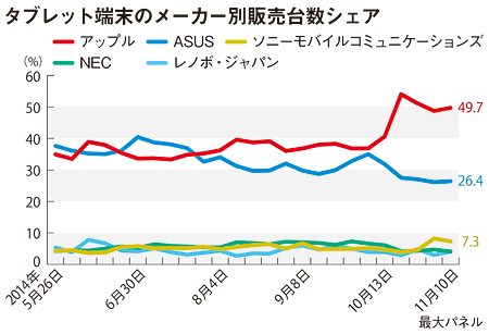 一方、2位のASUSは、10月初旬にWindowsタブレットの販売が若干伸びてシェアを戻した場面があったものの、基本的には右肩下がりで推移しており、アップルとの差が広がっている。3位以下は、依然、どんぐりの背比べだが、「Xperia Z3 Tablet Compact」が好調のソニーモバイルコミュニケーションズがややシェアを上げてきている。(道越一郎)