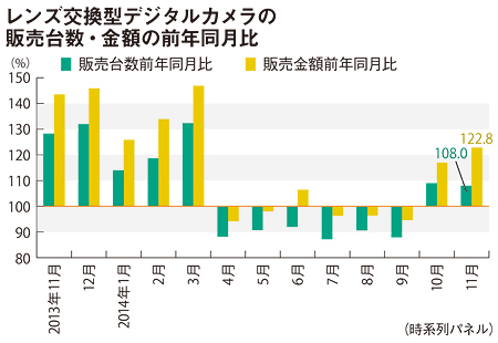 単価の高い一眼レフに勢いが戻ってきたのが要因だ。一方、ミラーレスモデルは、このところやや勢いが鈍化していて、安定した伸びが持続できなくなってきた。11月にはレンズ交換デジカメに占める販売台数構成比は35.7%に下がり、この1年で最低になっている。(道越一郎)
