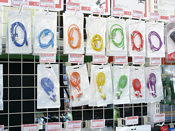 スマートフォン用のカラフルなUSB充電ケーブルが飛ぶように売れている 来店するヘビーユーザーのほとんどは常連客で、パソコンパーツを購入するほか、「