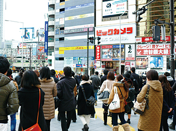 ビックカメラ渋谷東口店近くの宮益坂下交差点は多くの通行人で溢れている