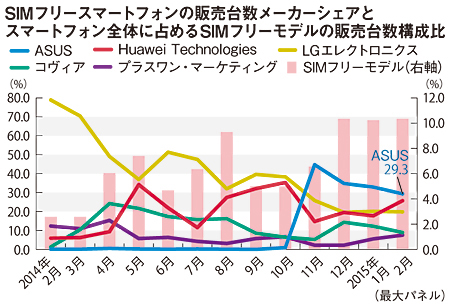 メーカー別では、2月現在でトップを走るのがASUSで販売台数シェアは29.3%。ファーウェイ、LGがそのあとに続く。上位陣はすべて海外メーカーだ。3月12日、VAIOは「VAIO Phone」を発表、この市場に参入すると名乗りを上げた。しかし他の国内メーカーは、どこまで本気でSIMフリーに取り組むのか、依然不透明だ。(道越一郎)