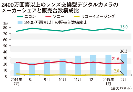 高画素数モデルに力を入れているのがニコンだ。現行モデルでは、D4sとDf以外のモデルはすべて2400万画素以上の高画素数モデルにシフト。このカテゴリでの販売台数シェア7割以上を維持している。D5300やD3200など価格がこなれてきており、販売を伸ばしている。このほか、ソニーとリコーがこのカテゴリの主要メーカーになっている。(道越一郎)