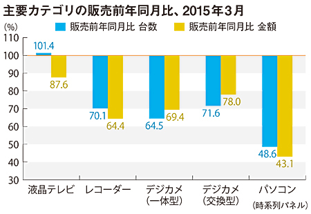 昨年はWindows XPサポート終了直前の駆け込みが重なった反動もあり、販売台数前年同月比は48.6%、販売金額でも43.1%といずれも昨年の半分以下に落ち込んだ。一方、健闘しているのが液晶テレビ。ケーブルテレビのデジアナ変換終了に伴う特需があったためで、金額こそ87.6%と2ケタ割れだが、台数は101.4%とかろうじて前年並みを維持した。(道越一郎)