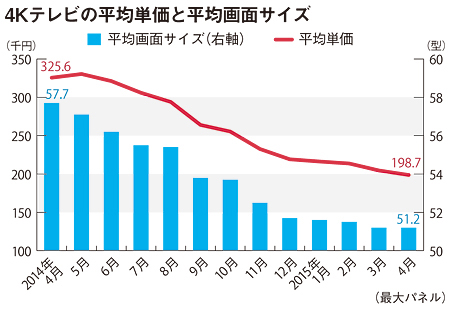 昨年4月の4Kテレビの平均画面サイズは57.7と55を超えていた。しかし、この4月には51.2と、かなり小さくなった。昨年の年末商戦あたりから50型前後の製品が拡大。55型未満の販売台数構成比がおよそ6割を占めるまでになっている。(道越一郎)