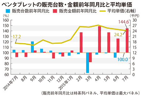 とくに販売金額を押し上げているのがディスプレイを搭載した高級ペンタブレットの存在だ。ワコムが1月に発売した13.3インチの「Cintiq 13HD」は税別平均単価が10万円前後にもかかわらず、7月の販売金額構成比で9.1%を占めている。ディスプレイ付きのペンタブレットは今後も拡大しそうだ。