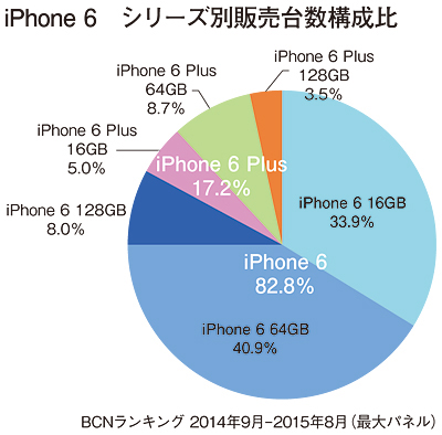 iPhone 6/6 Plus発売からこの8月までの1年間、モデル別の販売台数(BCNランキング集計)は4.7インチのiPhone 6が82.8%と大部分を占めた。