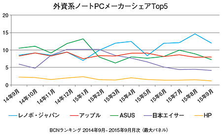 コンシューマのノートPC市場は、販売台数前年比で2ケタ割れが17か月連続で継続し、ふるわない。海外勢で2ケタシェアをとっているのはNECと連携するレノボだけ。他のメーカーはアップルを含めて1ケタシェアから脱すことができない。一方、需要の旺盛なSIMフリースマホ市場に目を向ければ、スマホに占める販売台数構成比は徐々に拡大し1割を突破。日本のスマホメーカーがキャリアとの連携を重視する一方、PCがだめならスマホと、中国、台湾、韓国を中心とした各メーカーが次々と参入する狙いは十分理解できる。