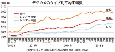 現在のデジカメの画素数は、カメラ市場全体で平均1800万画素あまり。レンズ一体型のカメラでは1800万画素弱、レンズ交換型では2000万画素前後というのが平均の画素数だ。レンズ一体型では高画素数化の動きが加速し始めている一方、レンズ交換型では2000万画素を天井に横ばいの状態が続く。