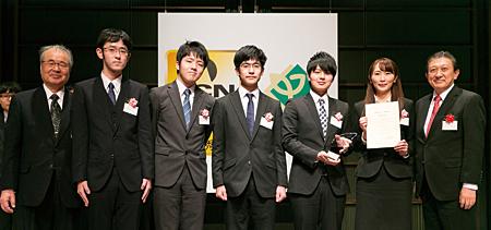 左から、ITジュニア育成交流協会の高橋文男理事長、後藤健太さん、鈴木大介さん、渥美亮祐さん、下中直紀さん、虻川みのりさん、トレンドマイクロの大三川彰彦副社長