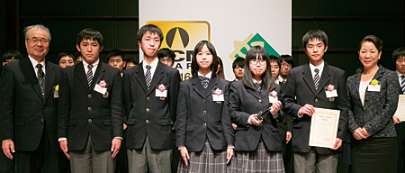 左から、ITジュニア育成交流協会の高橋文男理事長、岡島陸さん、臼井奈美恵さん、渡邊悠奈さん、山口勝士さん、シー・シー・ダブルの金成葉子社長